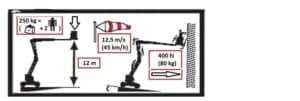 #215. W oparciu o przedstawiony wykres pola pracy określ maksymalne dopuszczalne obciążenie platformy roboczej uniesionej na wysokość 12 m i wysięgu 4 m :