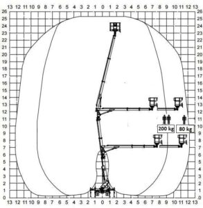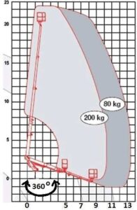 #235. W oparciu o przedstawiony wykres pola pracy określ maksymalne dopuszczalny wysięg podestu z obciążeniem 80 kg