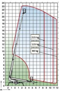 #205. W oparciu o przedstawiony wykres pola pracy wskaż maksymalny wysięg platformy roboczej obciążonej masą 215kg uniesionej na wysokość 22 m: