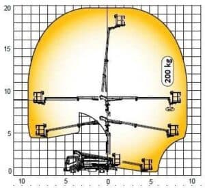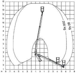 #233. W oparciu o przedstawiony wykres pola pracy określ maksymalne dopuszczalny wysięg podestu z obciążeniem 200 kg