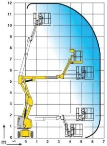 #196. W oparciu o przedstawiony wykres pola pracy wskaż maksymalny wysięg platformy roboczej obciążonej masą 100 kg uniesionej na wysokość 14 m:
