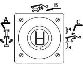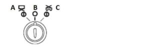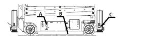 #87. Załączenie mechanizmu podnoszenia podestu nożycowego realizowane jest poprzez wychylenie dźwigni sterującej po wcześniejszym wciśnięciu przycisku oznaczonego literą: