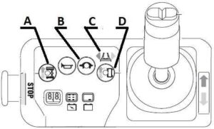 #86. Załączenie mechanizmu jazdy podestu nożycowego realizowane jest poprzez wychylenie dźwigni sterującej po wcześniejszym wciśnięciu przycisku oznaczonego literą: