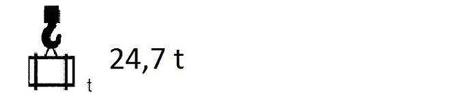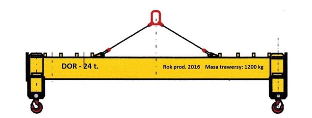 #261. Minimalny udźwig urządzenia dźwignicowego podnoszącego ładunek o masie 24 t przy użyciu przedstawionej trawersy wynosi: