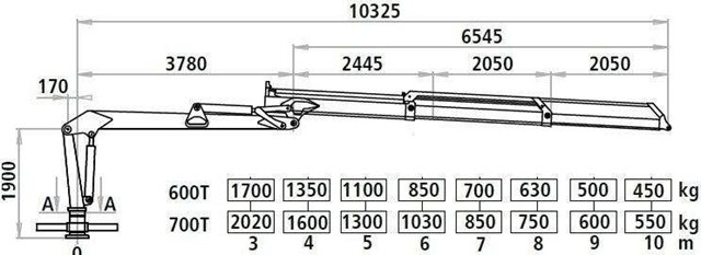 #239. W oparciu o przedstawiony diagram określ na jaką maksymalną odległość można bezpiecznie podać ładunek o masie 1300 kg żurawiem oznaczonym symbolem 700T: