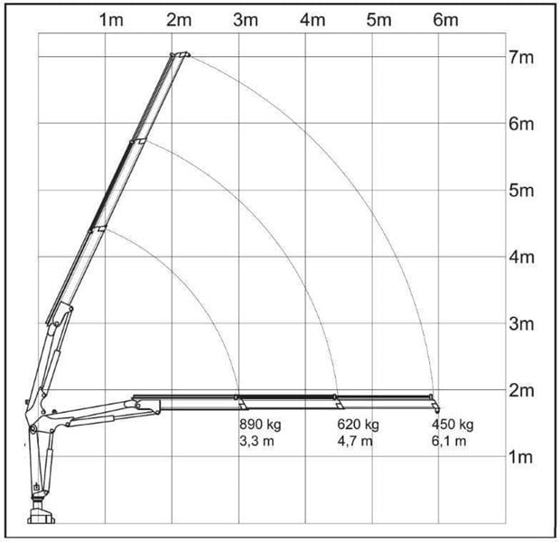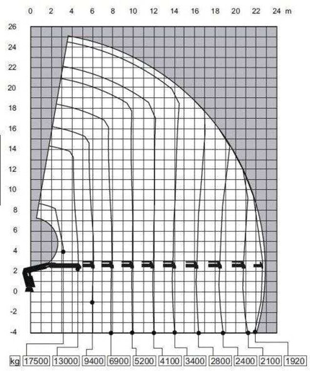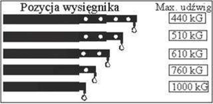 #226. W oparciu o przedstawiony diagram wskaż maksymalną masę ładunku, jaką można podać na odległość 4 m, przy wysokośći 5,8 m: