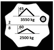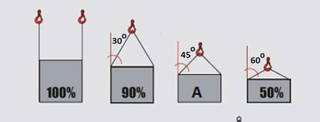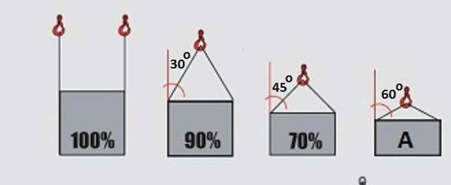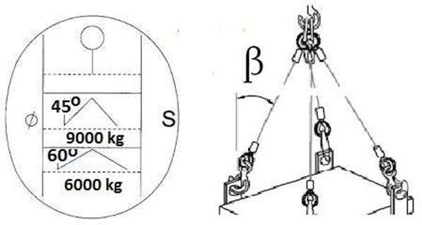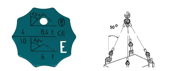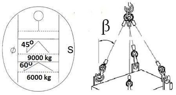 #314. W oparciu o przedstawiony rysunek określ maksymalną masę ładunku jaką można podnieść przy pomocy zawiesia 4 cięgnowego: